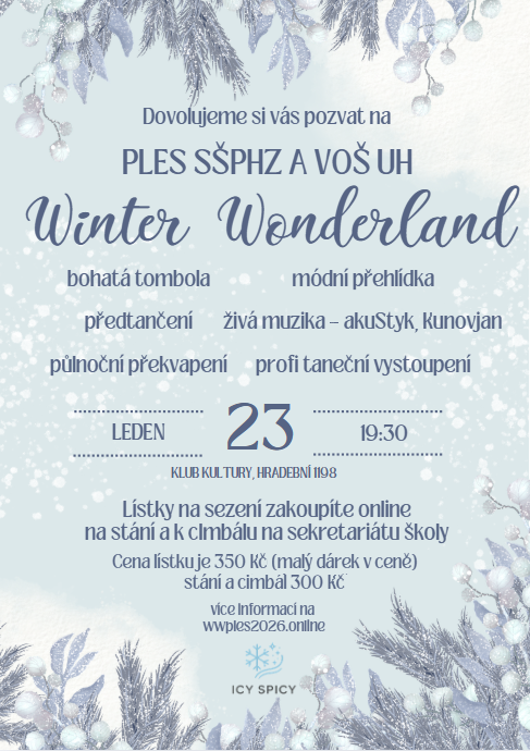 V pátek 23. 1. 2026 se bude opětovně konat ples naší školy. Prodej vstupenek do hlavního sálu a na balkon bude zahájen 14. 11. 2025 online a to ve výši 350 Kč/ks vč. malého dárku. Prodej vstupenek do malého sálu k CM Kunovjan a omezený počet vstupenek na stání ve výši 300 Kč/ks bude zahájen v úterý 19. 11. 2025 u paní R. Kaňovské.